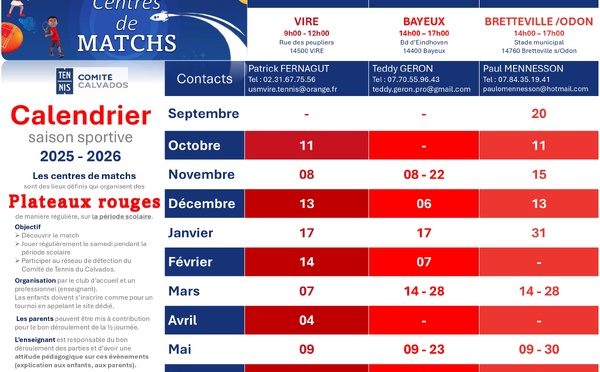 Vous trouverez ici le calendrier des tournois jeunes de septembre 2025 à juin 2026 diffusé par le Comité du Tennis du Calvados. Triés par catégorie et par date avec un accès par QR-code à Ten'Up...